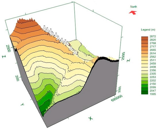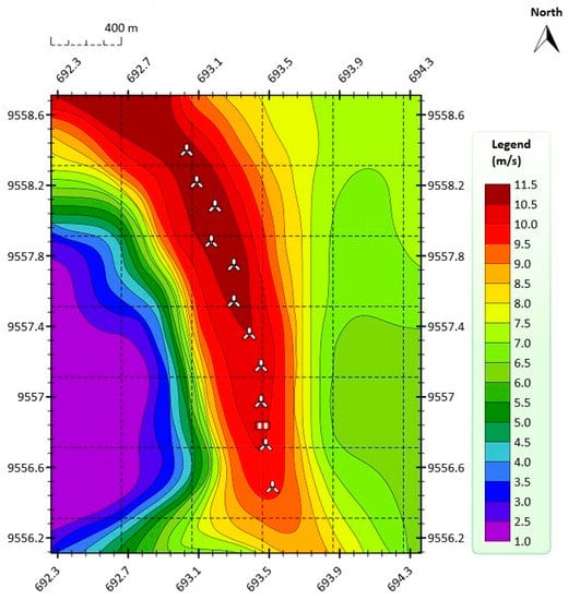 In this paper, in order to obtain the orographic map shown in Figure 1 and the annual average wind speed map shown in Figure 2, the Meteodyn WT wind resource assessment software was used [,,]. Here, the input variables used were the following: topographic and roughness data of the VWF; wind speed data of the meteorological tower located in the VWF; guaranteed power curve of the WTs; air density of the VWF (0.923 kg/m3); hub height of the WTs; wind turbine positions in UTM coordinates; and meteorological tower position in UTM coordinates.