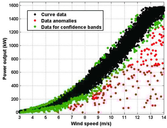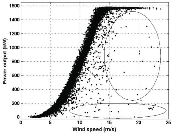 As was previously mentioned, the time measurement interval was from 1 October 2014 to 31 December 2014, the information about the wind speed and power output was taken from the Goldwind SCADA system, the hub height was equal to 65 m, and the sampling interval was equal to 10 min [,,,]. Figure 3 shows the scatter plot of the power output against the wind speed (i.e., the power curve) identifying some of the points (, ) that are affected by any anomaly.