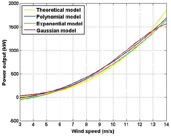 In order to measure the goodness of fit of the statistical model, the coefficient of determination (R2) and the root-mean-square error (RMSE) were used. Further, 100·R2 represents the percentage of the variability of the response that is explained by the model. Table 1 shows the estimated models for the power output in the wind speed interval [3 m/s, 14 m/s].