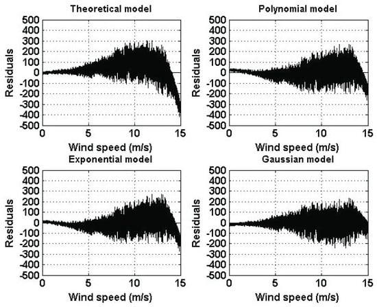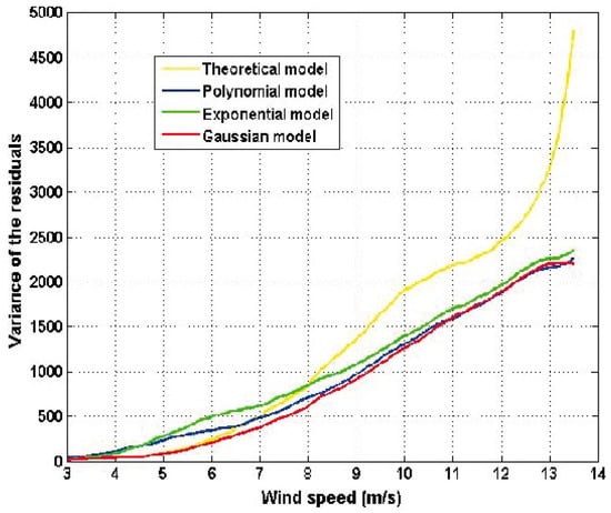 As a result of the similarity among the graphs shown in Figure 5, the residuals are similar in their form. Also, it can be seen that the error term has a variability that increases as the wind speed increases. Furthermore, residual variances are similar in terms of form and increase as the wind speed increases. Again, the residuals of the theoretical model are greater than the residuals of the other models. Moreover, the residual variance of the theoretical model is significantly greater than the variances of the other models. Therefore, assuming that the theoretical model is correct, there must exist a wind speed that compensates for in Equation (1) and the only place in Equation (1) where such a wind speed can be introduced is in the power coefficient, . For this reason, based on the experimental results, the authors of this paper believe that depends on the wind speed. The latter comment is also made by the authors of [,]. For the actual wind turbine under study, the Gaussian model is the best one.