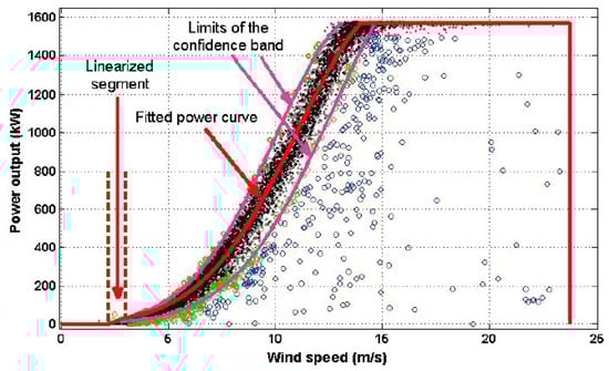Figure 8 shows the limits of the confidence band (i.e., the curve of high production efficiency and the curve of low production efficiency) and the estimated power curve (see Equation (9)). For this case, a = 40.6225, b = −88.5757, and = 1570 kW (see Equation (8)). In addition, all models estimated in this paper fell within this confidence band, and 93.8% of the power output points for the wind speed interval [3 m/s, 14 m/s] fell within this confidence band as well.
