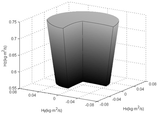 Substituting (2) into (1), and considering the physical parameters of the GyroWheel rotor listed in Table 1, the angular momentum workspace is obtained as shown in Figure 3 and Figure 4, respectively. In Figure 3, the angular momentum with constant spinning velocity and inconstant but finite tilt angle is displayed. Obviously, it is a part of a spherical surface whose radius is determined by the angular velocity of the rotor. Thus, the integral angular momentum workspace, including its cutaway view, is shown in Figure 4, which is a three-dimensional solid whose upper and lower surfaces are two spherical surfaces of different sizes. Hence, it is reasonable for the GyroWheel to provide exchangeable angular momentum in three-axis directions as an actuator like the variable speed double gimbal CMG [21].
