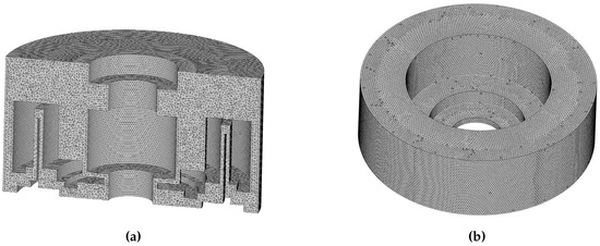 Schematic of the tetrahedral mesh with a number of 1987570. (a) Body mesh around the GyroWheel system; (b) Surface mesh of the GyroWheel rotor.