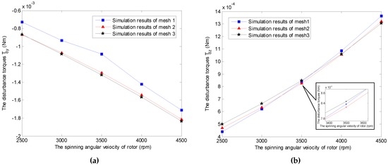 The mesh density is crucial to the numerical simulation from the viewpoints of computation accuracy and time consumption. It is necessary to meet a balance between the simulation requirements, e.g., the accuracy, and the consumption of the CPU time. Furthermore, the number of meshes should be sufficient in order to obtain mesh independent results [27,28]. In our simulation, the independence of computing mesh is verified by three cases considering the whole working space of the GyroWheel rotor, as shown in Figure 6, where the numbers of mesh1, mesh2 and mesh3 are 271,399, 1,217,196 and 1,987,570, respectively. Without loss of generality, the computation results of the transverse aerodynamic torque are selected for comparison. Obviously, the mesh independence is guaranteed when the mesh number is more than 1,217,196, where the results are convergent with respect to the increase of the mesh number. Therefore, the number of meshes used throughout this paper is chosen as 1,987,570 in the following simulations.
