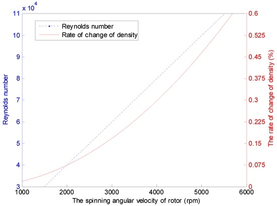Similarly to the flow around a rotating disk in a cylindrical casing and the flow around the impeller in a tank, the state of the inner airflow motion around the GyroWheel rotor can be described by the Reynolds number, which is a dimensionless number as shown in (9), where, in fact, the Reynolds number is represented by the ratio of the non-viscous force to the viscous force [29,30]. Meanwhile, the change rate of the air density can be represented by (10), where the spinning angular velocity of the GyroWheel rotor varies under isothermal condition. As is indicated in Figure 7, the Reynolds number of airflow motion around the GyroWheel rotor is extremely large, but the relative density change with respect to the angular velocity of the spinning rotor is relatively small, which means that the airflow is turbulent and incompressible:
