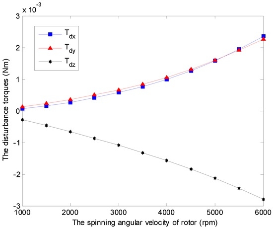 The time-varying feature of the spinning angular velocity is an iconic property for the GyroWheel system. In the sequel, the aerodynamic disturbance torque is considered with respect to the variation of the spinning velocity. Figure 9 indicates the relationship between the aerodynamic drag and the spinning angular velocity of GyroWheel rotor where the tilt angle and . According to the simulation results, , and increase with respect to the spinning angular velocity nonlinearly.
