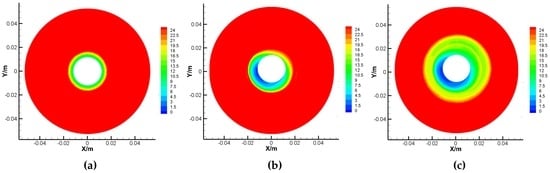Radial velocity contours of the GyroWheel under 0. (a) Results under 0 and 3500 rpm; (b) Results under 5 and 3500 rpm; (c) Results under and 2000 rpm.