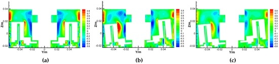 Axial velocity contours of the GyroWheel under 0. (a) Results under 0 and 3500 rpm; (b) Results under 5 and 3500 rpm; (c) Results under and 2000 rpm.