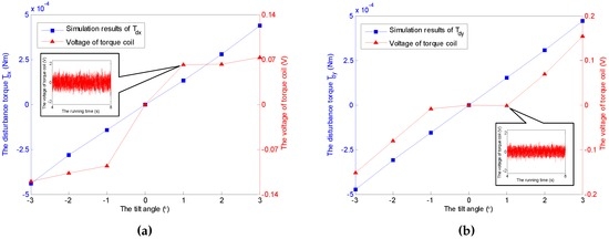 Without loss of generality, a constant angular velocity of 3500 rpm is considered here as an example. The aerodynamic disturbance torque with respect to the tilt angle is analyzed, as shown in Figure 8. It follows that the spin disturbance torque remains almost constant, and it hinders the rotation of the rotor. However, the transverse disturbance torques and exist under non-zero tilt angle, and increase with respect to the increasing of tilt angle. Furthermore, the two disturbance torques occur at the same time while the rotor tilts along one axis, which can be observed in both Figure 8 and Figure 9. Similar conclusions can be obtained under other spinning angular velocity conditions, which are ignored here.