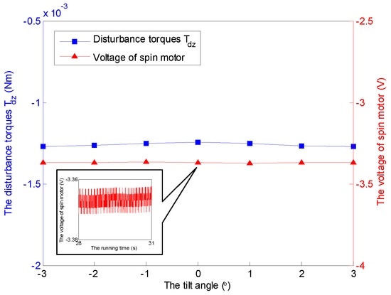 It should be noticed that the obtained voltages in experiments can not be converted to the torques directly due to the unknown moment coefficients of torque coils that are nonlinearly variable with the change of tilt angle, spinning angular velocity, run time and heating. Therefore, the voltage increments of the torque coils and the spin motor are used here to describe the variations of the corresponding transverse disturbance torques and the spin torque, while the tilt angle and the spinning angular velocity vary. According to the simulation cases under a constant spinning angular velocity of 3500 rpm and , the relationship between tilt angle of the GyroWheel rotor and the extra consumed voltages are illustrated in Figure 14 and Figure 15, which suggest that the tilting along one axis can lead to two-axis disturbance torques in transverse channels, which increase with respect to the increasing of tilt angle; however, the spin disturbance torque has nothing to do with the change of tilt angle. In Figure 16 and Figure 17, the spinning angular velocity is increased gradually, while is maintained at and is maintained at . The results indicate that the aerodynamic disturbance torques, both of the transverse disturbance torques , and the spin disturbance torque increase with respect to the increasing spinning angular velocity of the GyroWheel rotor, which is also consistent with the numerical simulations.