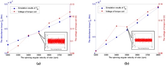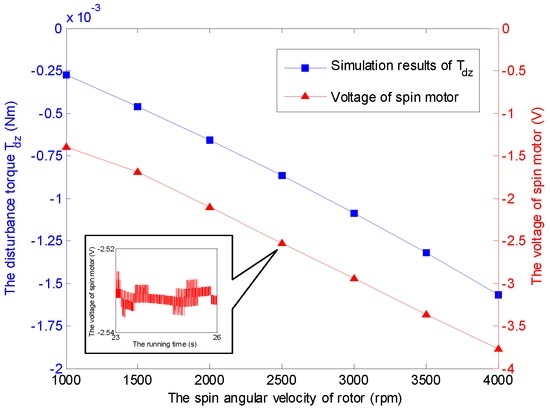 In our illustrated experiments, the tilt angle of GyroWheel rotor is limited within ±3 for the sake of security, and the angular velocity varying from static state to a maximum value of 4000 rpm, where we use 1000 rpm as the minimum value for the comparisons. The voltages of torque coils and spin motor, which reflect the corresponding aerodynamic drags in three directions, are sampled. The high-frequency noises, the fundamental frequency mainly caused by rotor unbalance and the second harmonic components caused by gimbal assembly are attenuated by utilizing some notch filters. Finally, the DC components of the actual data are obtained and used for comparision with the simulation results, as shown in Figure 14, Figure 15, Figure 16 and Figure 17.