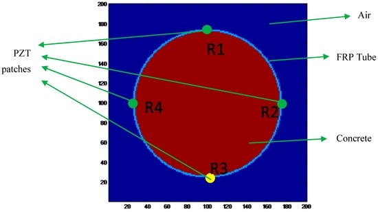 The CFFT under analysis consisted of an FRP tube and a concrete infill. The filling condition of the concrete directly affects the load bearing strength of the CFFT. Therefore, different filling conditions of the concrete inside the FRP tube were simulated numerically, and the wave traveling characteristics were analyzed. The geometry of the numerical model is shown in Figure 1. The concrete infill was encased by a FRP tube, and four PZT transducers were modeled. The PZT transducers can be used as either transmitters or receivers, which were equally arranged 90 degrees apart along the circumferential direction of the tube. A layer of ambient air was also established. The properties of the model are shown in Table 1. Note that the ultrasonic wave velocities in FRP material are about half of those in concrete material. The conditions of the concrete infill can be determined by comparing the arrival time of the waves.