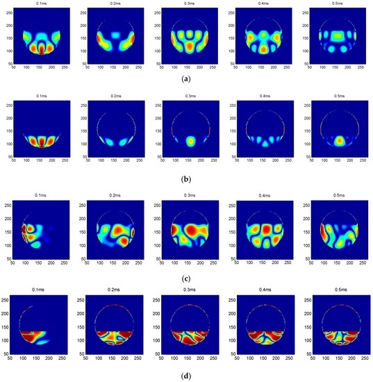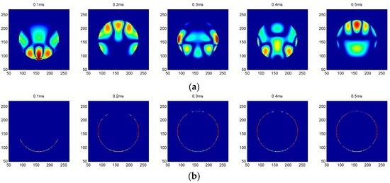 Figure 2 illustrates the snapshots excited by the R3 transmitter over time for both empty concrete and full concrete infills. As can be seen from Figure 2a, when the FRP tube was fully filled with concrete, the wave energy was concentrated at the concrete region because the waves propagated faster in concrete. The waves were received by R2 and R4 receivers first and were then received by R1. As for comparison, the snapshots were also analyzed when the FRP tube was free of concrete. Unlike the case of a full concrete infill, where the wave energy concentrated at the concrete, the wave energy was propagated via the wall of the FRP tube.