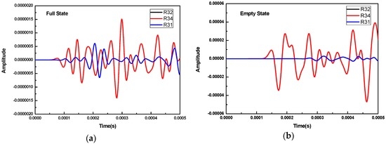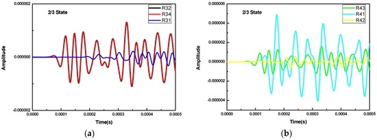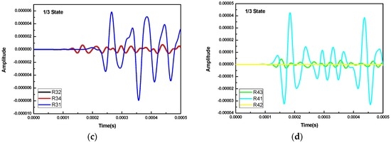 The waveforms of cross-excitation for the 1/3 and 2/3 concrete infill conditions are shown in Figure 5. For the case of the 2/3 concrete infill condition, when R3 is used as excitation source, as shown in Figure 5a, the waveforms received by R2 and R4 have the same arrival time and waveform amplitude, while the one received by R1 is lagging behind in arrival time and has a weaker amplitude. When R4 is used as an excitation source, as shown in Figure 5b, the waveform received by R3 is the same as R34, which share the same arrival time and amplitude. The waveform received by R1 has a large amplitude because the waveform propagates via the wall of the FRP tube. The waveform received by R2, mainly propagating through the concrete material, is the same as R31 in the full concrete infill condition as shown in Figure 3a.
