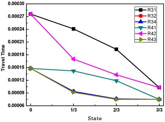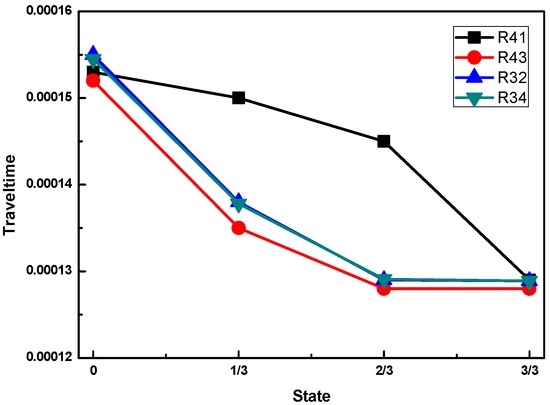 For the case of the 1/3 concrete infill condition, when R3 is used as the excitation source, as shown in Figure 5c, the waveforms received by R2 and R4 are the same in terms of arrival time and amplitude. The waveform received by R1 is substantially stronger than the one in the 2/3 concrete infill condition as the wave mainly propagates via the wall of the FRP tube. When R4 is used as the excitation source, as shown in Figure 5d, the waveform received by R3 propagates through both the concrete and the wall of the FRP tube. The waveform received by R1 propagates through the wall of the FRP tube and the one by R2 mainly via the concrete material. From the results of the above numerical simulation, the arrival time and the wave amplitude of the received waveforms for different receivers contain useful information about the concrete infill condition inside the FRP tube. Figure 6 shows the arrival time of different receivers for different concrete infill conditions. As can be seen that for both the empty (0) and the full (3/3) concrete infills, the waveforms of the receivers close to the excitation source, such as R32, R34, R41, and R43, share the same arrival time because they have the same propagation medium and distance. For the same reason, the waveforms of the receivers located farther away from the excitation source, such as R31 and R42, show the same arrival time. For the cases of the 1/3 and 2/3 concrete infills, the arrival time of the receivers shows different characteristics due to the different path and material of the propagation waves. In general, for the full concrete infill condition, the wave travels with the velocity in concrete material, and the time of flight between the transmitter and any receiver is a minimum value. If a void is created in between the transmitter and any receiver, as is the case for the 1/3 and 2/3 concrete infill conditions, the wave propagation path will be directed to the FRP tube before arriving the receiver, thus increasing the ultrasonic TOF. The ultrasonic TOF is at a maximum when there is no concrete infill in the CFFT. Such characteristics can then be utilized to identify the concrete infill condition inside a FRP tube and determine the location of the defects.