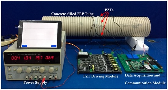 The experimental setup of the concrete infill detection of the CFFT using PZT-based TOF is shown in Figure 7. The CFFT was fabricated with four PZT actuators installed 90 degrees apart from each other on the wall of a FRP tube (shown in Figure 1). Four concrete infill conditions were created in sequence according to the analysis of the numerical simulation, including empty, 1/3, 2/3, and full concrete infill conditions. The configurations of empty, 1/3 and 2/3, and full concrete infill conditions were used to simulate the concrete infill process during the concrete casting of the CFFTs, which require continuous monitoring to ensure the proper coupling between the FRP tube and the infilled concrete. For existing CFFTs, voids and debonding may develop due to inadequate compaction and concrete shrinkage, which were also approximated by the 1/3 and 2/3 concrete infill conditions. During the experiments, the PZT driving module actuated one of the PZTs; at the same time, the data acquisition and communication module collected the waveforms from the receivers and sent the data to a tablet via Wi-Fi. Since the data acquisition and communication module has only two input channels, the two PZT receivers next to the PZT transmitter were used to receive the waveforms.