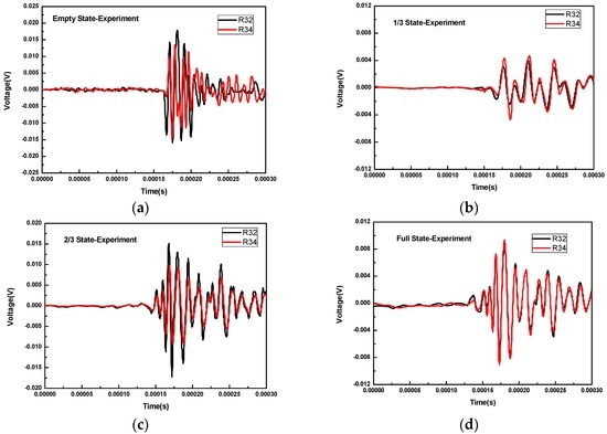 The waveforms received by R2 and R4 for different concrete infill conditions when R3 is used as transmitter: (a) the empty concrete infill; (b) the 1/3 concrete infill; (c) the 2/3 concrete infill; (d) the full concrete infill.