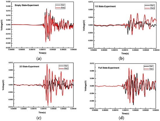 The waveforms received by R1 and R3 for different concrete infill conditions when R4 is used as transmitter: (a) the empty concrete infill; (b) the 1/3 concrete infill; (c) the 2/3 concrete infill; (d) the full concrete infill.