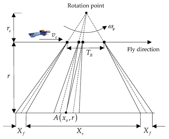 The acquisition geometry of the TOPS mode in the slant range plane is shown in Figure 2, where and represent the minimum distance from the virtual rotation point to the SAR sensor and to the ground, respectively, is the effective velocity, is the burst time, is the point target located at (), corresponds to the valid area with full illumination time, and corresponds to the area with insufficient illumination time. The TOPS mode employs a counter-clockwise antenna beam steering at a constant rotation rate of , leading to reduction of target illumination time. By adopting the hybrid factor [1], the azimuth resolution can be approximately given by: