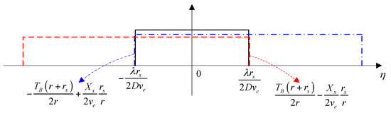 In the same way, we can calculate the boundary value difference with respect to the target located at , which is also equal to zero. As shown in Figure 4, the range of is always wider than for all targets located in . So, the first term plays a dominant role in Equation (12), and the azimuth signal after de-rotation can be rewritten as follows: