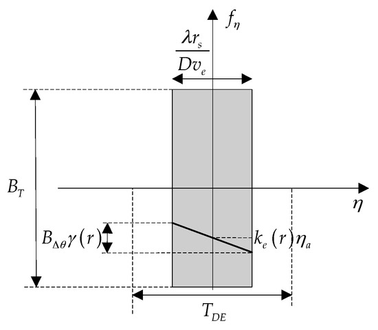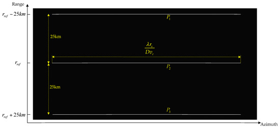 Furthermore, according to Equation (23), the frequency domain width after derotation is limited by the first term, so targets located at different azimuth positions are separated, with the accumulated Doppler bandwidth and Doppler centroid given by: