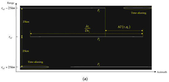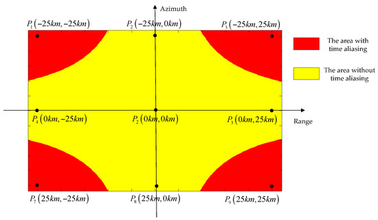 According to Equation (35), since the time shift is proportional to the sub-swath coverage, time aliasing will occur for wide-swath coverage TOPS data processing, especially at the scene edge. With the parameters listed in Table 1, Figure 6 shows the time aliasing area, which is highlighted in red.