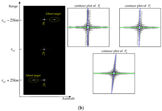 The time aliasing effects of point targets , and are shown in Figure 7, with their positions indicated in Figure 6. Since and are located at the time aliasing area, significant time aliasing has occurred as shown in Figure 7a, which results in ghost appearance and contour plot distortion, with reduced azimuth resolution, as shown in Figure 7b.