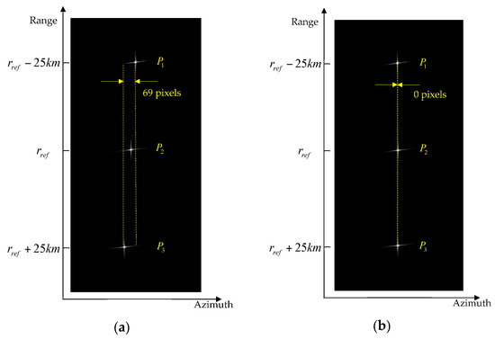 As shown in Figure 7a, using the range-independent deramp, significant time aliasing occurs, which leads to ghost target appearance and azimuth resolution reduction. By implementing the range-dependent deramp operation proposed in our algorithm, time aliasing is completely removed as shown in Figure 10.