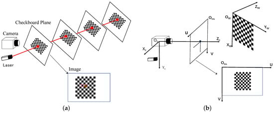 We place the checkerboard at different poses. At each pose, the laser falls on the checkerboard plane and forms a spot. This laser spot’s coordinate is represented as in the camera coordinate system. The function of the laser beam can be calculated if we get all of these laser spots’ coordinates. In order to get the coordinate of each laser spot, we utilize these two constraints at each different checkerboard pose: