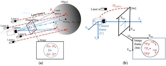 Finally, by substituting Equation (20) into Equation (18), the reconstructed 3D coordinate of laser spot i with respect to frame can be represented as follows:
