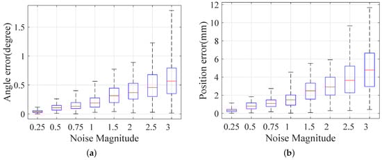 Simulation of the pose errors with different pixels of the diameter: (a) result with 0.5 pixels of noise; (b) result with one pixel of noise.