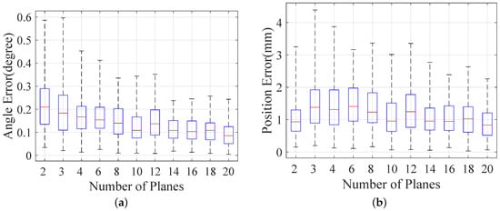 Error distribution under different numbers of poses in the range of [2, 20]: (a) angular error of direction; (b) position error.