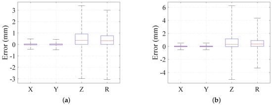 In reality, the detection of laser spots can be influenced by the inappropriate exposure parameter and image noise, which will introduce random noises in the calculation. To ascertain the effects of noise on the proposed system, two different levels of random noises are added in , respectively: random variation of the pixel error and the [ pixel error. After taking noises into account, the geometric parameters are calculated for the simulated spheres with a radius of around 60 mm. We randomly place the simulated sphere at 2000 different positions over a distance of 500 mm. The results for all of the noise levels are shown with the boxplot. As shown in Figure 6, the maximum absolute errors of position and radius in the noise simulation are less than 3.4 mm and 3 mm, for an added noise of 0.5 pixels. The errors increase to 6.3 mm and 4.3 mm at higher pixel noises.