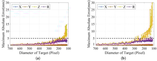 It is known that the accuracy of pose estimation for the cooperative target has a strong relationship with the distance. However, our target is non-cooperative, which means the accuracy is influenced by the distance and the size of the target simultaneously. Thus, the pixel of the diameter of the target is used to represent the effective measuring range of our system. We repeat the simulation 2000 times, which randomizes the radius and positions of the simulated sphere within the designed scenario and calculates its geometric parameters with noises added. The statistics of the maximum absolute errors under different pixels of the diameter are shown in Figure 7.