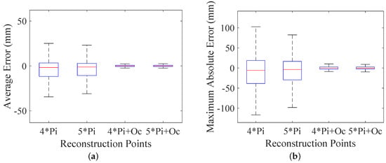 Finally, in order to validate the improvement of applying geometric prior term, optimizations without the geometric prior term are simulated to compare with the proposed method. In this comparison simulation, we successively use four laser spots, five laser spots, four laser spots with the geometric prior term and five laser spots with the geometric prior term to optimize the geometric parameters at 1000 different positions. The statistics of the average errors and maximum absolute errors are shown in Figure 8.