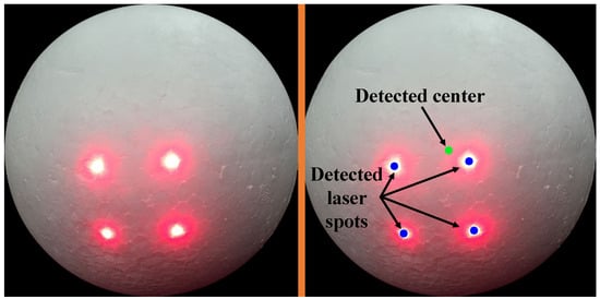 The image of the target sphere (left) and detected laser spots and the center point (right).