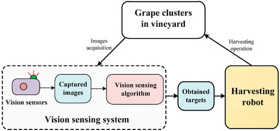 The vision sensing system of the harvesting robot included vision sensors and sensing algorithm, which can be simply shown in Figure 1. The vision sensors (e.g., cameras) were mainly responsible for collecting vineyard images, and the sensing algorithms were responsible for detecting and extracting the harvesting targets from the collected images.