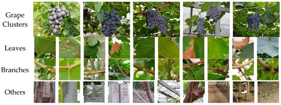 Examples of the dataset images. The top row listed the images of grape clusters captured under different lighting conditions, and the lower rows were background including leaves, branches, and other obstacles in the vineyard.