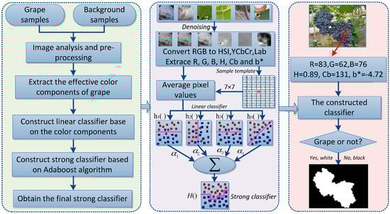 Principle diagram of the proposed grape detection algorithm is shown in Figure 3, which can be encapsulated in following steps: firstly, the images captured at vineyard were pre-processed, and several effective color components (e.g., H, Cb, b*, R and B) were extracted by contrasting and analyzing the color difference between the background and the grape clusters. Secondly, four linear classification models were constructed based on the dataset and these extracted components. Thirdly, the strong classifier was obtained by training the four weaker classifiers using the AdaBoost framework, which could be calculated by the sum of four weak classifiers multiplying their weights. Finally, the pixels of the captured images were distinguished and then identified by using the strong classifier. If the pixel it was grape then was set 1 (white), or set 0 (black). The noises in the binary images were eliminated by the region threshold method and morphological filtering, and the grape clusters were marked finally by using the enclosing rectangle method.