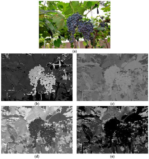 Several effective color components of images which can distinguish well the grape clusters from the background. (a) Original image; (b) H component image; (c) Cb component image; (d) b* component image; and (e) R-B component image.