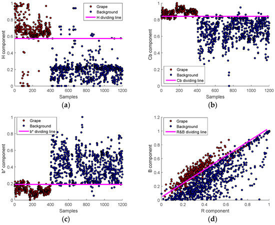 Figure 5a–d show the distribution of average pixel value of 1200 samples on H, Cb, b*, B&R components and the corresponding dividing lines between grape and background were obtained by the LCE method.