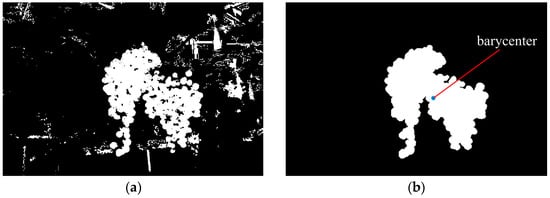 After finishing the training of the final strong classifier, we used it to distinguish the pixels of the captured images and identify if it is grapes or not. A sub-window (7 × 7 pixels) for every pixel was allocated in a captured image using a sliding window approach, and then calculated out the average pixel values of each sub-window in the images of the elected color components, and input the values into the strong classifier to verify whether the pixels were classified as grape. If the result of the final strong classifier was positive, the pixel would be considered to be grape (white), and if the result was negative, the pixel would be considered to be background (black). Figure 6a is the result image of Figure 4a obtained by using the strong classifier.