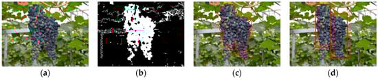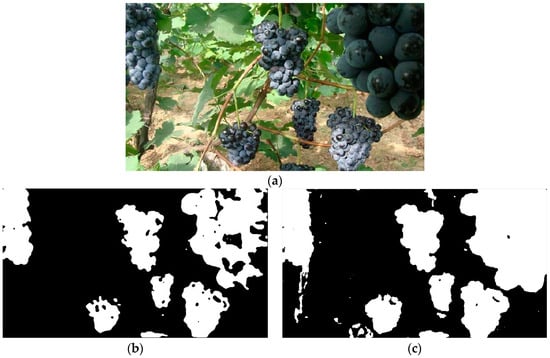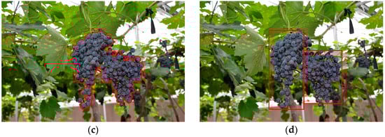 When some unripe grape berries appeared among the ripe grape clusters or multiple grape clusters overlapped, false or failure identification would occur, and it would be difficult to accurately detect the grape clusters. As it can be seen in Figure 9, some unripe berries whose color was green and three overlapping grape clusters could be found in Figure 9a, and from the segmentation result in Figure 9b we can see that those unripe berries at the bottom of the left grape clusters were not identified, so that final detection results in Figure 9c were not ideal. At last, only the right grape cluster was correctly detected, the left grape clusters were not accurately detected.