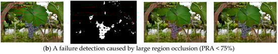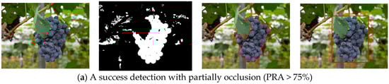 Detection process of the grape clusters under the different occlusion degrees. (a) a success detection with partially occlusion (PRA > 75%); and (b) a failure detection caused by large region occlusion (PRA < 75%).