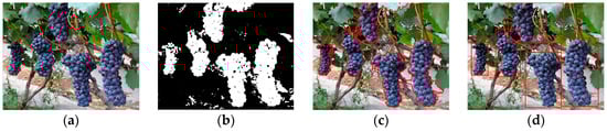 In addition, in order to test the applicability of the developed approach for other black varieties besides the tested ‘Summer Black’ grape variety, the ‘Cabernet Sauvignon’ whose color was similar to the ‘Summer Black’ was also tested. As it can be seen in Figure 10, the grape clusters in the images were finally detected, and only a small number of ground and reflective leaves pixels were misclassified into the grape. However, it could be seen that the developed approach was sensitive to the color information and the training samples had important influence on the final detection results.