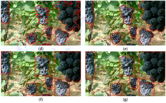 The comparison of the detection process between the method [18] and the proposed method, (a) Original image; (b) Initial segmentation image by the method [18]; (c) Initial segmentation image by the proposed method; (d) The detected contour of the grape clusters by the method [18]; (e) The detected contour of the grape clusters by the proposed method; (f) The detection result by using the method [18]; and (g) The detection result by using the proposed method.