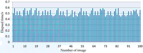 The detection speed on the targets, which determines the harvesting efficiency of robots, is very crucial for robotic harvesting. To determine whether the developed method could be used in harvesting robots, the elapsed time of the whole algorithm was computed using the clock function in Matlab, and the experiments were conducted on the 100 images that were randomly chosen from the captured images. The elapsed time of these images was showed in Figure 12. The result indicated that the elapsed time of every image was less than 0.59 s, and the overall processing time varied approximately from 0.43 s to 0.59 s.