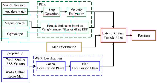 In recent decades, various low-cost inertial sensors have been equipped in the off-the-shelf smartphones due to many functional requirements, and meanwhile the Wi-Fi network has also been widely deployed in the indoor environment. Thus, the PDR and Wi-Fi localization approaches are recognized as the two most promising approaches used for indoor localization. The earliest work focusing on the fusion of the PDR and Wi-Fi localization is discussed in [17]. The authors achieve the integration of the inertial sensors and Wi-Fi module by using both the PF and KF. In concrete terms, as one of the most important parameters in the PDR, the heading of the pedestrian is estimated by the KF, which fuses the output of the gyroscope and the angle of trajectory calculated by the Wi-Fi localization. However, the approach is limited in terms of localization accuracy since their performance significantly depends on the robustness of Wi-Fi localization. In [18], the authors propose an adaptive integration frame to fuse localization information from the GPS/MARG and Wi-Fi/MARG integrated subsystems, and meanwhile use a Sequential Importance Resampling (SIR) PF approach to integrate the Wi-Fi RSS measurements and data from the MARG sensors. The particles are calculated by using the velocity and attitude coming from MARG sensors, while ignoring the impact of Wi-Fi observation data on particle sampling. In this paper, we depend on the EKF with observation data from the Wi-Fi and MARG sensors to optimize the IDF for the sake of reducing the number of particles and approximating the true posterior distribution.