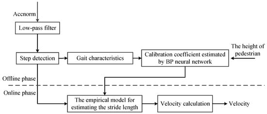 We rely on the data from the tri-axial accelerometer to estimate the velocity of the pedestrian, as shown in Figure 2. In the offline phase, we optimize the calibration coefficient of an empirical model by using the Back Propagation (BP) neural network [26], and then use this model to estimate the stride length. In concrete terms, we first calculate the relative magnitude of acceleration, which is defined as the difference between the local and measuring acceleration, namely Accnorm, and meanwhile use a low-pass filter to eliminate the noise involved in Accnorm. Second, we perform the step detection to extract the gait characteristics, such as the gait frequency and statistical quantities of acceleration magnitude, i.e., mean, variance, maximum, and minimum of Accnorm. Finally, we optimize the calibration coefficient based on the BP neural network. In the online phase, we estimate the stride length and velocity of the pedestrian by using the empirical model and step detection respectively in a real-time manner.