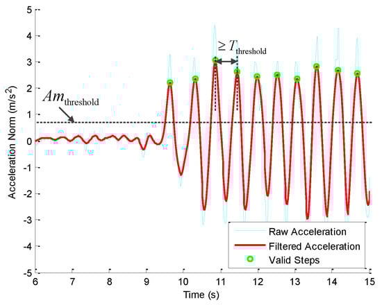 Due to the error of the installation of inertial instruments, we rely on the periodic variation of Accnorm to detect the gait of the pedestrian. In Figure 3, the abnormal peaks are caused by the random self-dithering of the human body and the noise of sensors. By setting the interval between every two adjacent local maximum values as no smaller than the time threshold and the local maximum values as larger than the amplitude threshold , the valid steps (with green circles) are detected in Figure 3. Considering that the pedestrian approximately takes two steps for each second and the updating rate of the data from the MARG sensors is 50 Hz, we set s and m/s.